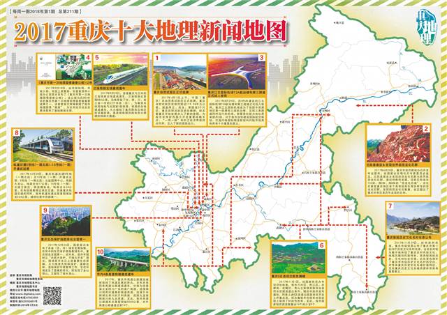 重慶日報訊 (記者申曉佳)2017年剛剛過去,哪些重要事件改變了我們的生活?1月3日,在重慶市規劃局指導下,重慶市地理信息中心、重慶地理學學會地理文化與科普專業委員會、重慶地理地圖書店聯合發布《2017重慶十大地理新聞地圖》,一圖呈現上述部門聯合評選的2017年發生在重慶的十大地理事件。中國(重慶)自由貿易試驗區正式掛牌、云陽普安鄉發現世界級恐龍化石群、重慶江北國際機場T3A航站樓和第三跑道正式投入使用等均入選其中。