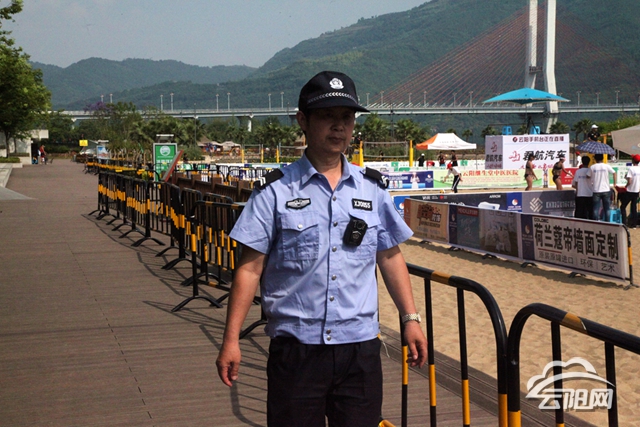云陽網訊(實習生 劉浮生 彭博)5月17日下午,在全國沙灘排球巡回賽云陽站比賽現場,記者發現,除了努力拼搏的運動員、熱情好客的觀眾外,還有這樣一群人,他們不懼似火的驕陽,時刻關注著賽場的每個角落。他們就是此次比賽現場維持治安的工作人員。