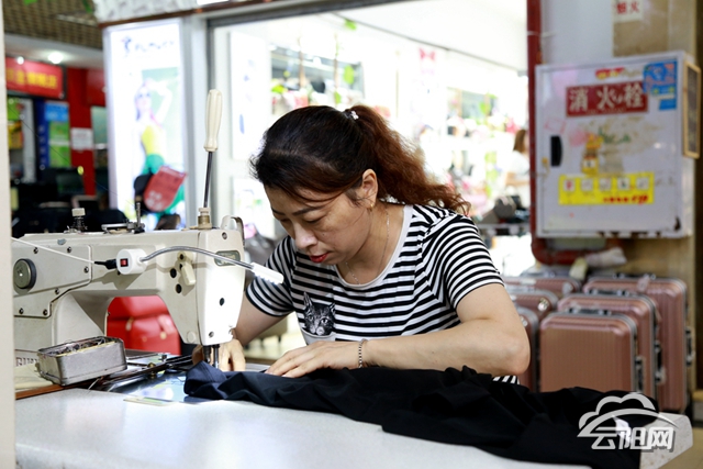 一臺縫紉機(jī)、十幾轱轆線,外加一張板凳,便是縫補(bǔ)工楊暑蘭全部家當(dāng)了。店面不大,里面掛滿了顧客送來的衣物。