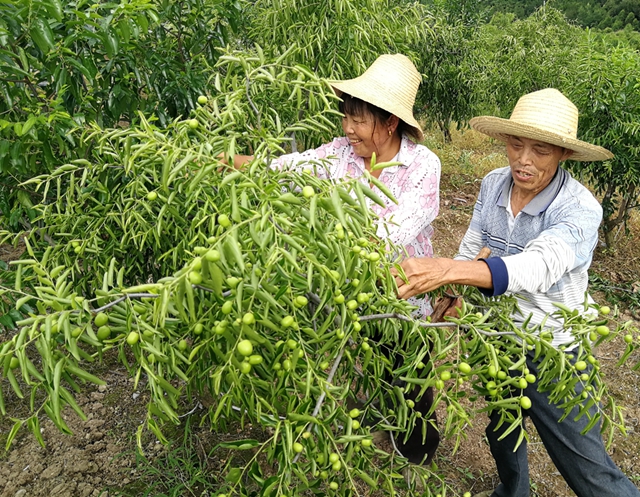 6月24日,南溪鎮鹽渠村的冬棗示范基地里,工人們正在將弱果、壞果、小果全部摘掉,確保冬棗的質量和口感。據悉,該基地有冬棗200畝,預計在9月份進入采摘期。(王彬彬 攝)