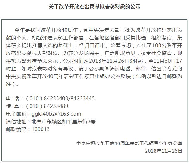 今年是我國改革開放40周年,黨中央決定表彰一批為改革開放作出杰出貢獻(xiàn)的個(gè)人。根據(jù)評(píng)選表彰工作部署,在各地區(qū)各部門反復(fù)比選、組織考察、集體研究提出推薦人選的基礎(chǔ)上,經(jīng)歸口評(píng)審、統(tǒng)籌考慮,產(chǎn)生了100名改革開放杰出貢獻(xiàn)擬表彰對(duì)象。為充分發(fā)揚(yáng)民主,廣泛聽取意見,接受社會(huì)監(jiān)督,現(xiàn)將擬表彰對(duì)象予以公示,公示時(shí)間從2018年11月26日8時(shí)起,至11月30日17時(shí)止。如對(duì)擬表彰對(duì)象有異議,請于公示期間通過電話、郵件、信函等方式向中央慶祝改革開放40周年表彰工作領(lǐng)導(dǎo)小組辦公室反映(信函以到達(dá)日郵戳為準(zhǔn))。