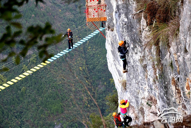 云陽(yáng)網(wǎng)訊(記者 丁齊)1月1日,時(shí)值元旦假期,云陽(yáng)龍缸景區(qū)新開通的“飛拉達(dá)”項(xiàng)目——云端彩橋正式建成對(duì)外開放,吸引了云陽(yáng)、奉節(jié)、利川等地的數(shù)百名戶外運(yùn)動(dòng)愛好者前來體驗(yàn)。游客猶如蜘蛛俠一般,行走在陡峭的巖壁和600米的空中,感受御風(fēng)而行的刺激和凌空而行的驚奇。