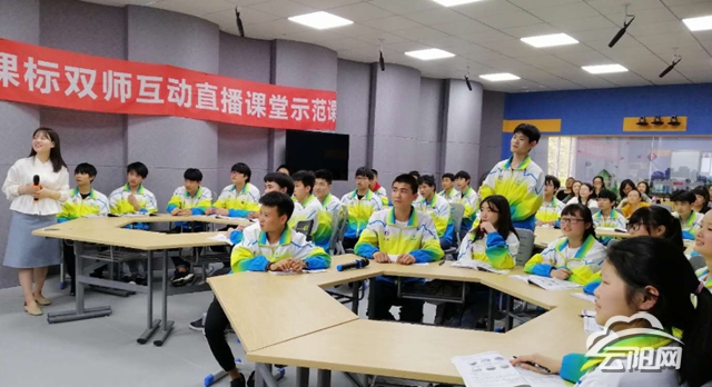 云陽網訊(記者 楊梅娜 通訊員 張小林)近日,云陽職教中心“英語課標雙師互動直播課堂”在該校錄播教室正式開課。2017級計算機高考班的學生們端坐在教室內,通過在線教學,面對面聆聽外籍名師的直播課,同時,師生頻頻互動,現場學習氛圍熱烈。