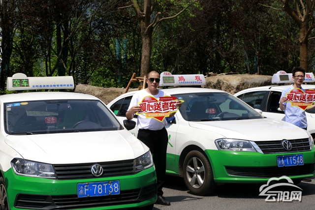 云陽網訊(記者 王彬彬)6月3日,在濱江大道上,鵬程出租車正在貼“愛心助考”的標志,這二十輛出租車正是云陽鵬程出租公司的高考直通車。