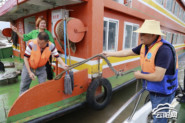 一年365天,袁軍每天都在云陽長江段航行幾十公里,他早上7點半到達(dá)碼頭,檢查船舶各種設(shè)備,給機艙做衛(wèi)生,確保船艙干凈、整潔。船只8點半準(zhǔn)時從碼頭出發(fā)。這段時間正是汛期,而長江里的水位下降快,他們航行的重點工作就是提醒過往船舶遵守水上交通秩序,確保安全航行。在工作中,袁軍用文明語言與過往船只進行交流,提醒船只注意安全。