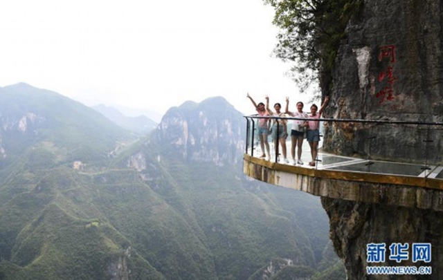 7月30日,游客在云陽龍缸國家地質(zhì)公園絕壁玻璃棧道上留影。 云陽龍缸國家地質(zhì)公園位于重慶市云陽縣東南隅,深處三峽庫區(qū)腹心,景區(qū)內(nèi)地貌奇特、雄險俊秀、風景壯美。 新華社記者王全超攝