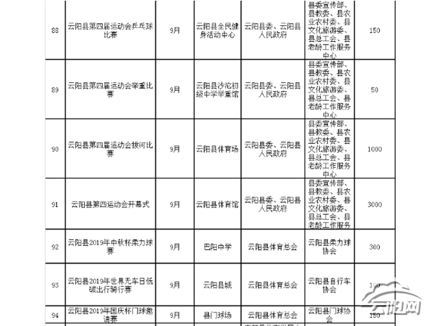 據介紹,9月將開展的體育賽事主要有云陽縣第四屆運動會開幕式、云陽縣2019年中秋杯柔力球賽、云陽縣2019年世界無車日低碳出行騎行賽、云陽縣2019年國慶門球邀請賽。其中,云陽縣第四屆運動會的各項比賽也將繼續展開角逐,包括乒乓球比賽、舉重比賽、拔河比賽等,屆時我縣的運動健兒們將在賽場上為市民獻上精彩對決。