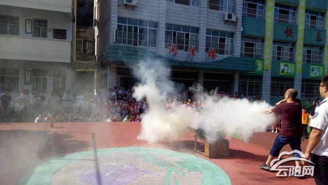 在消防應急疏散演練活動中,學校在安全處放上對人體無害的煙霧彈,模擬學校某處發生初期火災,學校老師組織學生疏散逃生并撲滅“火災”的場景。在老師的帶領下,學生們捂住口鼻,低頭彎腰,井然有序的撤離至安全區域。