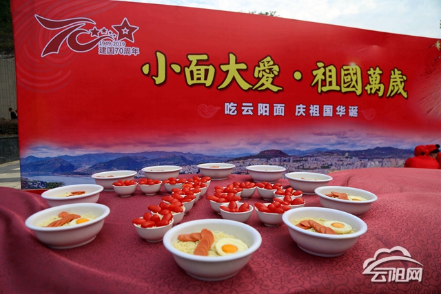 云陽網訊(記者 丁齊)過生日,吃一碗長壽面才有儀式感。為慶祝新中國成立70周年,10月1日,縣文旅委在云陽龍缸景區擺出一桌特殊的宴席,邀請廣大游客和居民參與‘小面大愛·祖國萬歲’吃云陽面,慶祖國華誕活動。