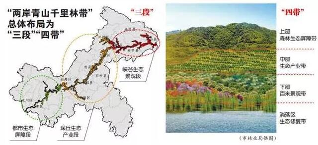 “兩岸青山千里林帶”總體布局為“三段”“四帶”。其中,“三段”具體是:峽谷生態景觀段(包括云陽、奉節、巫山、巫溪4個縣),結合生態旅游重點打造三峽紅葉景觀與脆李、臍橙等生態林;深丘生態產業段(包括長壽、涪陵、武隆、豐都、忠縣、石柱、萬州、開州8個區縣),結合生態產業重點布局柑橘、筍竹等特色經果林,兼顧生態景觀林打造;都市生態屏障段(包括永川、江津、巴南、大渡口、九龍坡、南岸、江北、北碚、沙坪壩、渝北10個區),結合城鎮污染防控措施重點提升城市生態屏障功能,兼顧景觀品質與特色經果林發展。