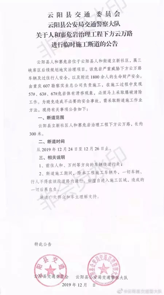 2019年12月24日至12月26日止,云陽縣立新社區人和寨危巖治理工程下方云萬路,長約300米路段將繼續斷道施工,斷道期間除本工程施工車輛外,一切車輛、行人不得在該段道路內通行,請前往人和、萬州等方向的車輛繞道行走,感謝廣大群眾和駕駛人理解和支持。