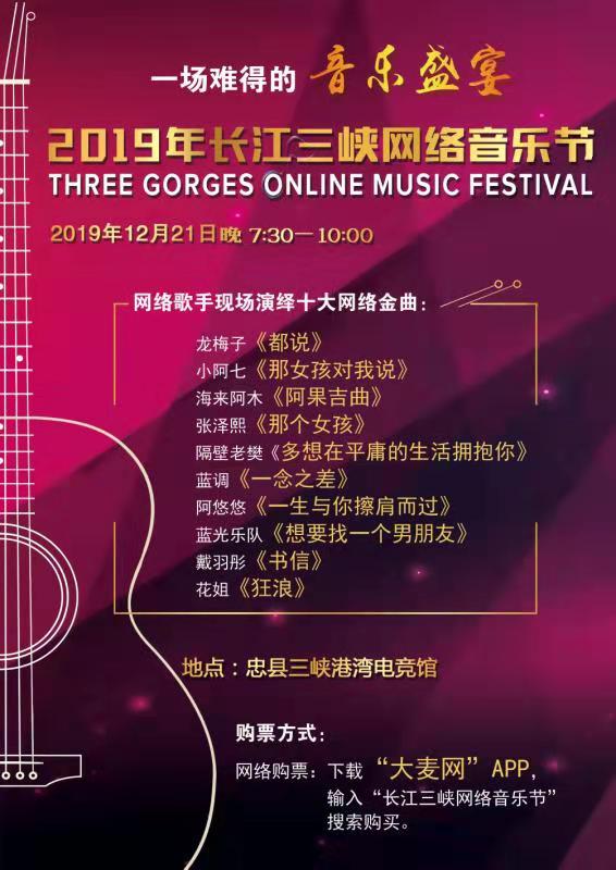 2019年長江三峽網絡音樂節頒獎典禮門票正在火熱發售。網絡購票:下載“大麥網”APP,輸入“長江三峽網絡音樂節”,搜索購買。咨詢電話:023-81199109。