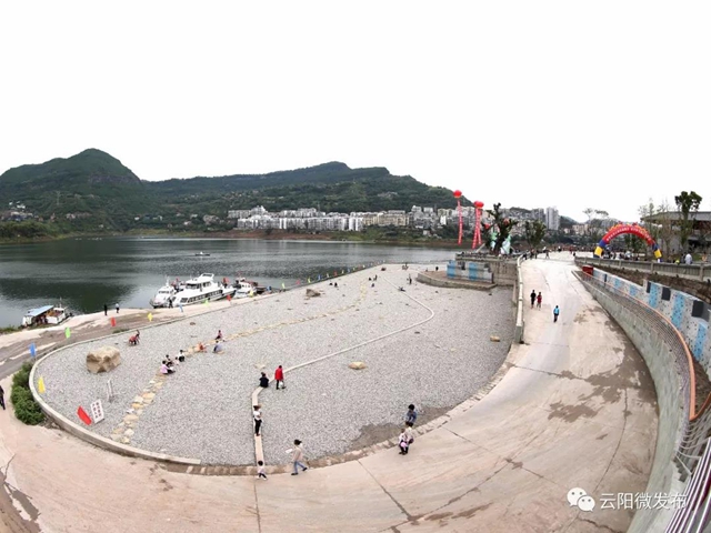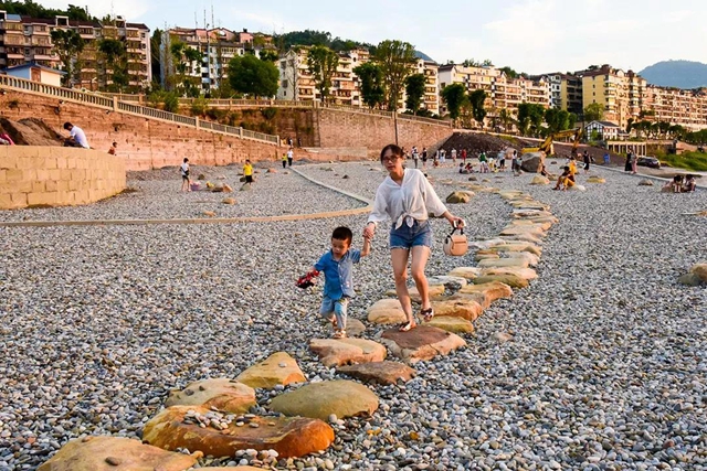 四方井碼頭結合廣場、河灘地、防洪堤,依水建景,用鵝卵石和河沙“還原”了老城長江沙灘……