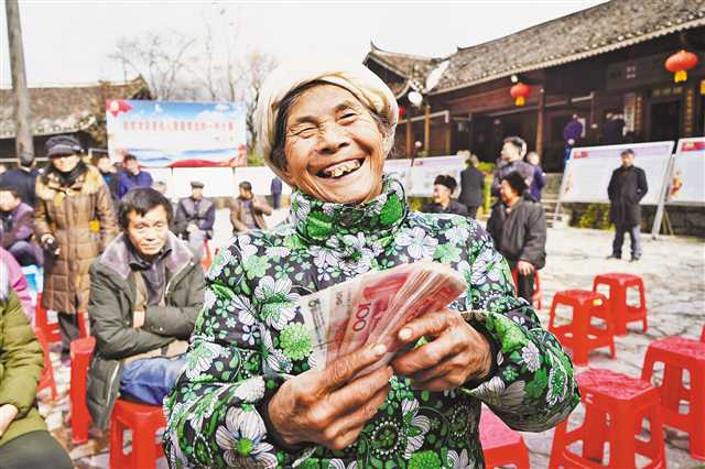 武隆區后坪鄉天池苗寨文化廣場,村民劉遠銀以房屋、土地入股合作社發展鄉村旅游,獲得分紅一萬余元,笑得合不攏嘴。(攝于二○一九年十二月二日) 重報集團全媒體記者 李斌 攝