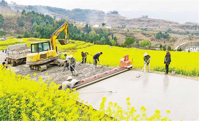 豐都縣三建鄉夜力坪村產業扶貧示范基地,工人在硬化社道公路。2018年,全村50余戶村民以土地入股,發展西瓜、南瓜、蘿卜、油菜等周期短、見效快、風險小的產業項目,確保穩定增收。(本報資料圖片) 通訊員 熊波 攝