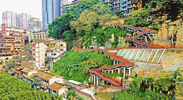 既可緩解車堵又方便游客步行到景點游覽的洪崖洞步道,把上半城的解放碑與嘉陵江邊的洪崖洞緊密相連。 特約攝影 鐘志兵