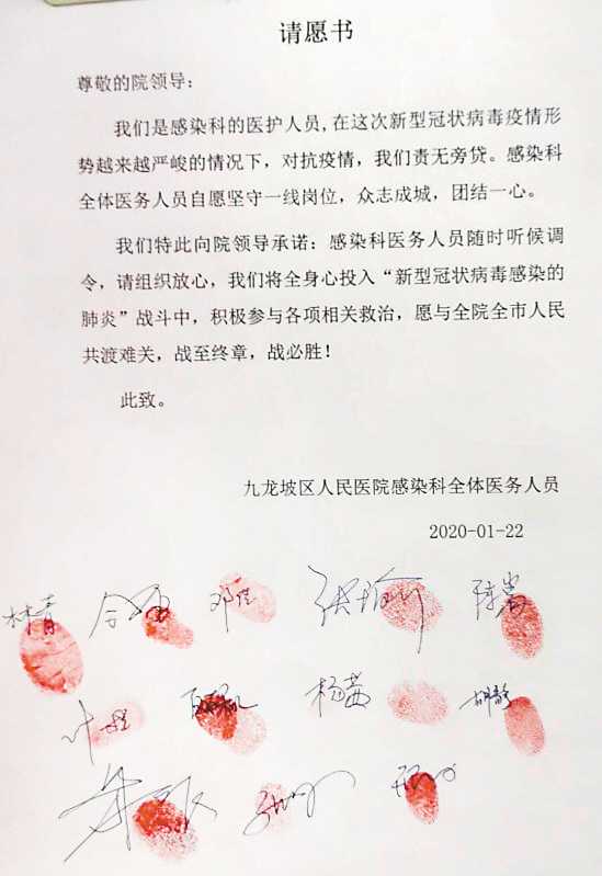 1月22日一大早,鄧佳和團隊成員集體向醫院遞交了“請愿書”。“感染科全體醫務人員自愿堅守一線崗位,眾志成城,團結一心。”