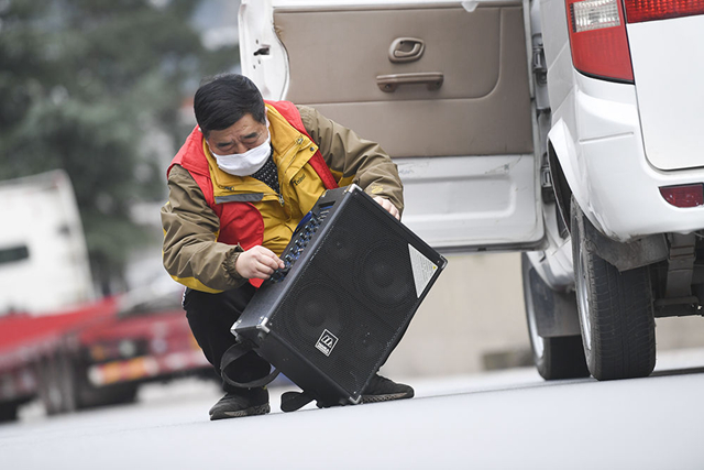2月4日,工作人員在重慶市云陽縣巴陽鎮永利村將用于疫情防控宣傳的擴音設備放進車里。 新華社記者王全超攝
