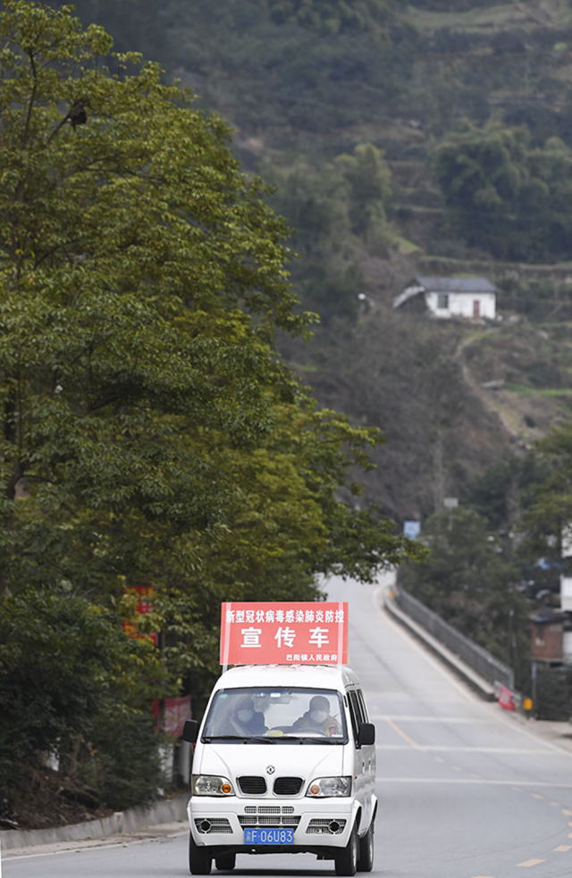 2月4日,通過車載廣播進行疫情防控宣傳的車輛行駛在重慶市云陽縣巴陽鎮永利村。 新華社記者王全超攝