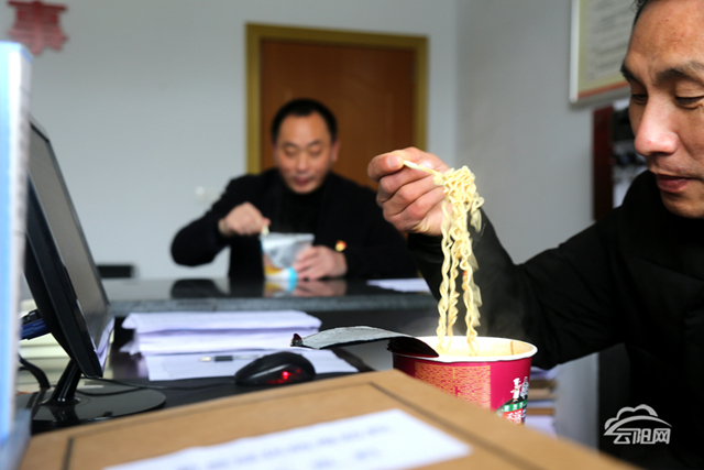 從疫情防控工作開始,張玉安幾乎每天是最早來最晚走,困了就在辦公室打會盹,餓了就吃一桶泡面。