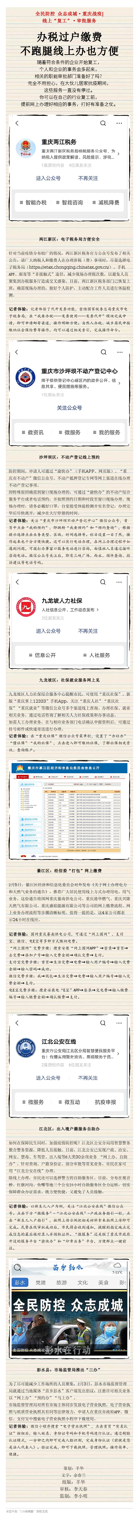 華龍網-新重慶客戶端2月10日17時50分訊(記者 袁舒含)今(10)日,符合條件的企業將分批復工復產,企事業和個人的審批申請會多起來。值得一提的是,重慶市各級專業審批服務部門并沒有休息,通過網上或線上線下并舉的方式,解決各類審批需求。以下圖解,只是其中的幾個代表性審批服務機關,通過他們,你會感受到網上辦事的效率和便利。