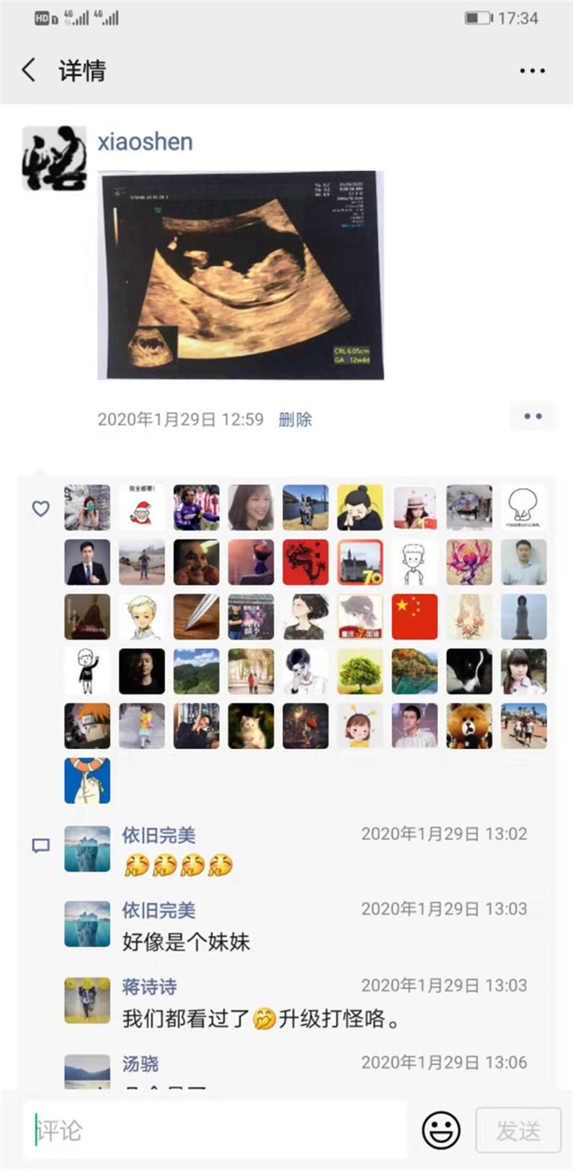 由于孕反十分嚴重,王麗珍在1月29日做好層層防護,獨自一人去醫院進行必要的產檢。當天下班后,向來不愛發朋友圈的申鄧分享了一張B超圖片,圖里胎兒的雛形可見,沒有任何的文字,卻能感受到申鄧為人父的激動。同事們紛紛點贊留言,送上祝福,說這是我們的“執法二代”,“年齡最小的執法隊員”……