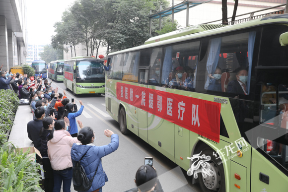 2月13日下午1點(diǎn)半,重醫(yī)附一院160名醫(yī)護(hù)人員乘坐大巴前往機(jī)場(chǎng),奔赴武漢。華龍網(wǎng)-新重慶客戶端記者 張質(zhì) 攝