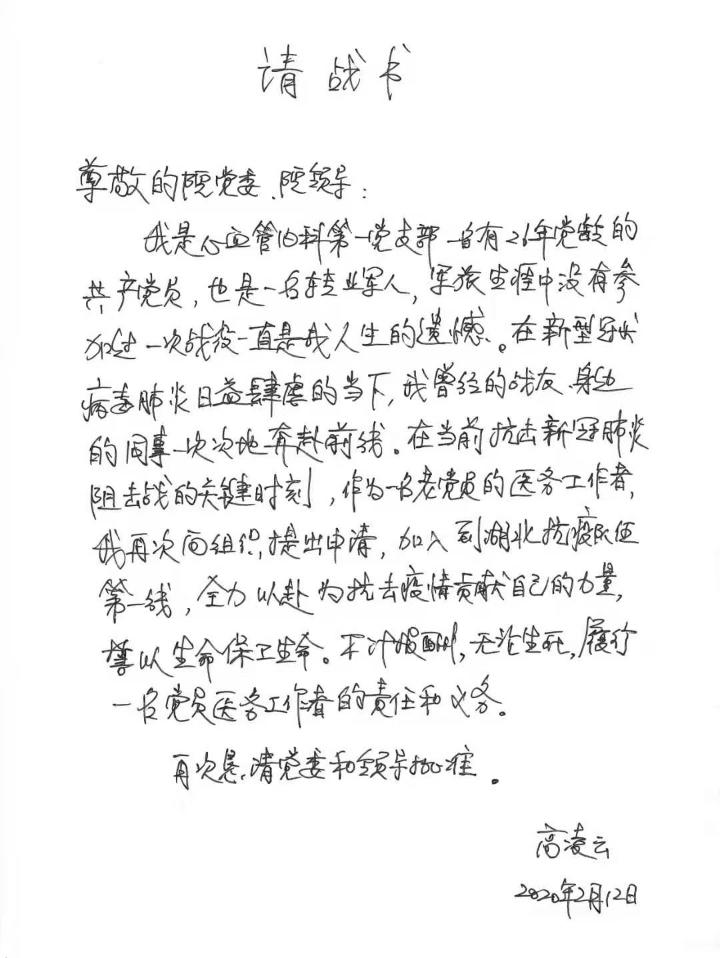 高凌云2月12日的請(qǐng)戰(zhàn)書(shū)。重醫(yī)附一院供圖 華龍網(wǎng)發(fā)