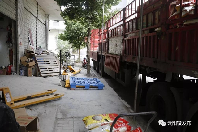 接到群眾舉報后,記者第一時間趕往工業園區人和組團,在云陽縣甘氏商貿有限公司倉儲的門口,幾輛大卡車停留在那里,工人正在轉運貨品,而大部分工人并沒有戴口罩。