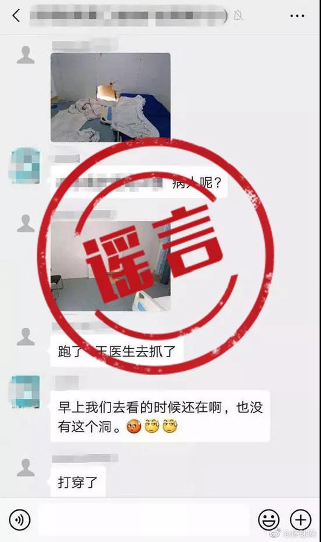 16日,一張微信群聊截圖在網上瘋傳,截圖顯示:群聊名稱為“某醫院第二批醫護戰友群”。圖上有病房的夾板墻壁被挖了一個洞的照片。有人配圖稱“某醫院有確診病人出逃”,甚至有人傳“跑了8個”。