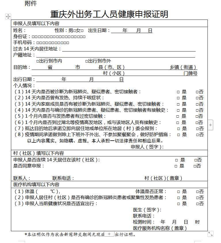 (二)服務內容。居住地醫療衛生機構對有外出務工需要的申報人在開展流行病學史調查和測量體溫的基礎上,為符合條件的申報人員免費出具市衛生健康委印制的《重慶市外出務工人員健康申報證明》(詳見附件,以下簡稱證明)