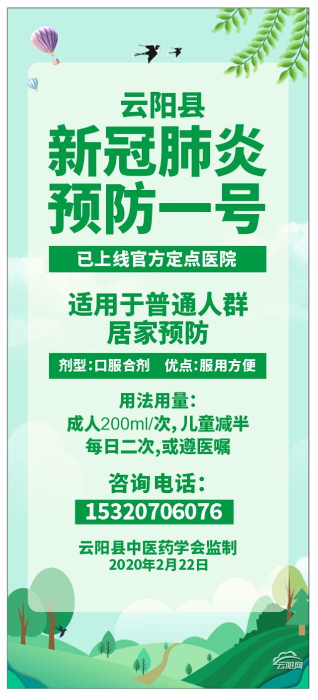2月22日,云陽(yáng)縣新冠肺炎疫情防控工作領(lǐng)導(dǎo)小組醫(yī)療救治組,根據(jù)國(guó)家衛(wèi)生健康委辦公廳、國(guó)家中醫(yī)藥管理局辦公室《關(guān)于印發(fā)新型冠狀病毒肺炎診療方案(試行第六版)的通知》等有關(guān)文件,組織云陽(yáng)縣中醫(yī)藥學(xué)會(huì)專(zhuān)家組召開(kāi)關(guān)于進(jìn)一步加強(qiáng)新型冠狀病毒肺炎中醫(yī)藥救治工作專(zhuān)題會(huì),經(jīng)研討決定,在原制定的云陽(yáng)版“新冠肺炎預(yù)防處方”基礎(chǔ)上,再次開(kāi)出針對(duì)云陽(yáng)普通人群預(yù)防新冠肺炎的中藥預(yù)防處方。