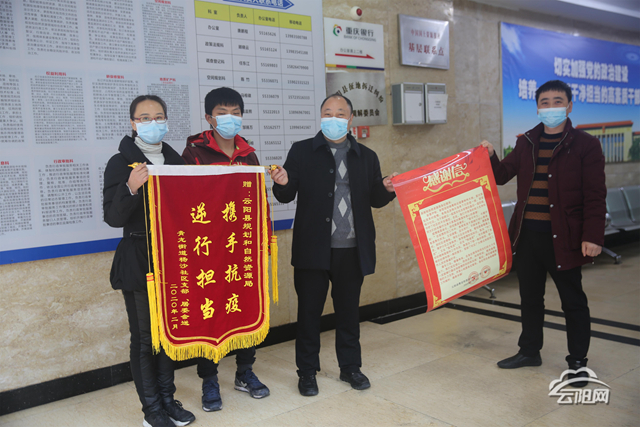 云陽網訊(通訊員 余中華)“感謝規劃自然資源局的志愿者們,你們幫社區抗疫,幫助解決了許多實際問題,我們送上錦旗表示感謝!”2月26日,青龍街道有關工作人員會同楊沙社區工作人員把一面寫有“攜手抗疫,逆行擔當”的錦旗和一封熱情洋溢的感謝信送到縣規劃自然資源局,對該局志愿者的辛勤付出表達誠摯謝意。