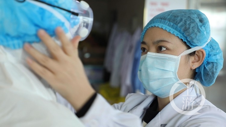 2月27日下午,黃霞出現在重癥肺炎應急區的安全區,忙著為“戰友”春花細心穿戴白衣“戰袍”,時不時地問一句:“會不會太緊?”