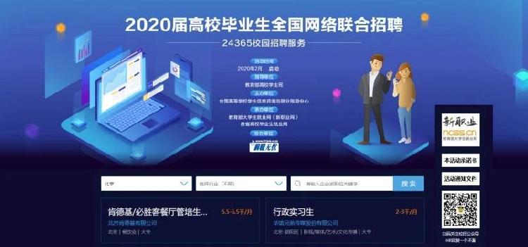 2月28日,教育部啟動“2020屆高校畢業生全國網絡聯合招聘——24365校園招聘服務”活動,為高校畢業生提供每天24小時全年365天的網上校園招聘服務,畢業生可登陸活動平臺(www.ncss.cn)及各有關網站專欄參加求職招聘。