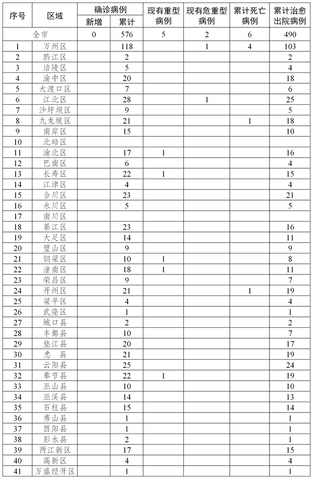 新增治愈出院病例中,萬州區5例、涪陵區1例、江北區2例、九龍坡區1例、南岸區1例、合川區1例、綦江區1例、大足區1例、銅梁區1例、墊江縣2例、忠縣1例、云陽縣1例、奉節縣1例、巫山縣1例、石柱縣1例。