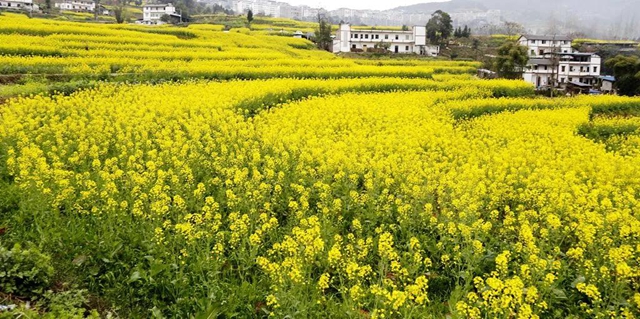 眼下,在棲霞鎮(zhèn)的各處田野里,徐徐鋪開一片片金黃。漫山的油菜花似乎都在共同訴說著春日的浪漫詩意。當(dāng)行走在油菜花田間,空氣中彌漫著濃濃的花香,目光所及之處,蜂飛蝶舞,花團(tuán)錦簇,房前屋后的田地里、土坡中都開遍了油菜花,美不勝收。