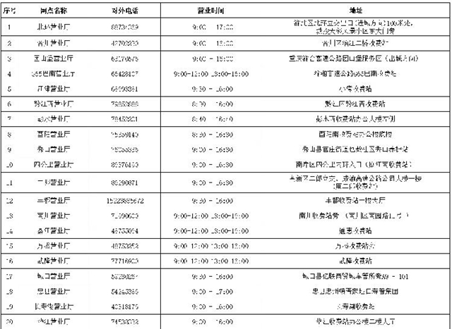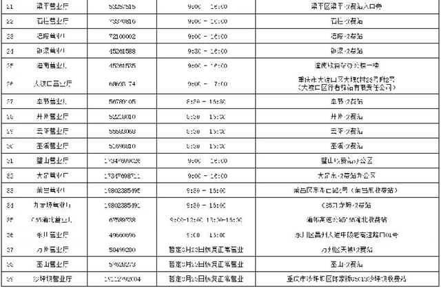 3月16日起對外營業網點如下:北環、合川、G65巴南、江津、黔江西、彭水、酉陽、秀山、團山堡、豐都、南川、綦江、萬盛、武隆等36個ETC自營服務網點正常營業,其他3個ETC自營服務網點暫定23日起營業。