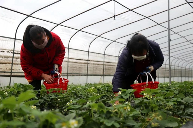 近日,小編在鳳鳴鎮陽之鳳生態采摘園看到,一顆顆鮮紅的草莓點綴在綠葉間,兩名工人戴著口罩、提著籃子正在大棚內采摘草莓。