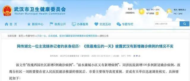3月22日凌晨,武漢市疫情防控指揮部涉疫大數(shù)據(jù)與流行病學(xué)調(diào)查組通報(bào):《我最難忘的一天》披露武漢有新增確診病例的情況不實(shí)。該文曾以“湖北一位主流媒體記者”的名義,稱武漢有新增確診病例。