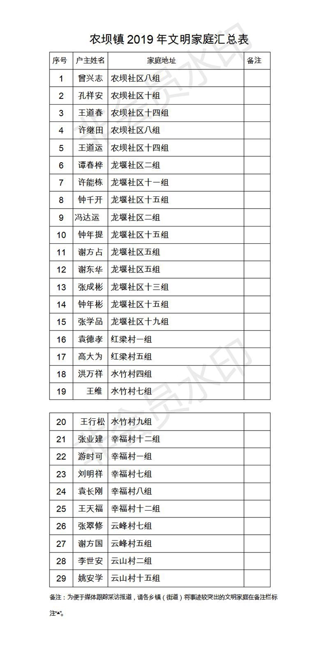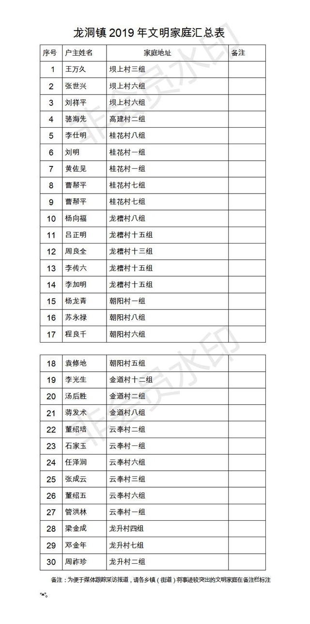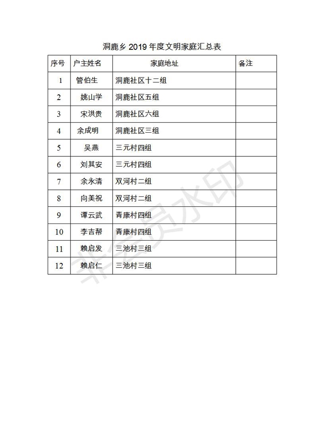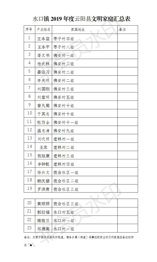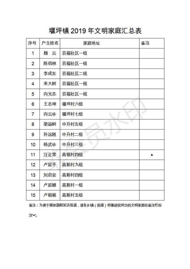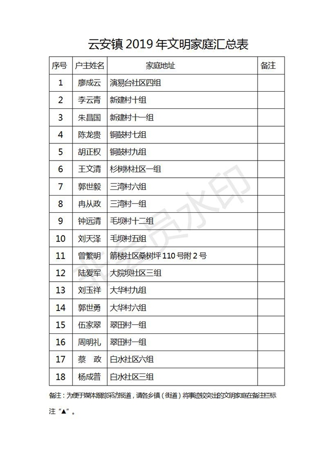 根據(jù)《云陽(yáng)縣精神文明建設(shè)委員會(huì)關(guān)于深化文明家庭創(chuàng)建評(píng)選活動(dòng)的通知》(云文明委〔2017〕4號(hào))和《關(guān)于對(duì)文明家庭創(chuàng)建評(píng)選活動(dòng)有關(guān)事項(xiàng)作出調(diào)整的通知》(云文明辦白頭)文件要求,縣文明辦認(rèn)真組織開展2019年度縣級(jí)文明家庭創(chuàng)建評(píng)選工作,經(jīng)村(社區(qū))自評(píng)、鄉(xiāng)鎮(zhèn)(街道)初評(píng)、縣文明辦終評(píng)等程序,已評(píng)選出2019年度縣級(jí)文明家庭。現(xiàn)將2019年度縣級(jí)文明家庭名單公示如下。