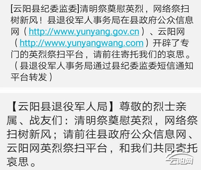 活動中,縣退役軍人事務局借助新媒體發布“致敬·2020清明祭英烈”網上祭掃活動倡議書,在縣人民政府公眾信息網、云陽網開設英烈祭掃平臺,并通過短信群發的方式向全縣烈士親屬、退役軍人、軍屬推送網上祭掃短信3萬余條,主動對接縣紀委監委平臺向全縣干部職工同步進行推送4萬余條,共同引導大家樹網絡祭掃新風。