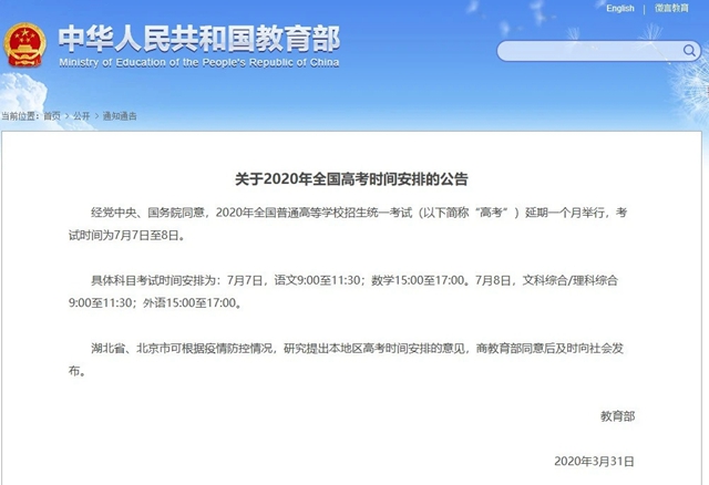 1.【云陽家長注意:今年高考延期一個月】3月31日,教育部發布《關于2020年全國高考時間安排的公告》。2020年全國普通高等學校招生統一考試延期一個月舉行,考試時間為7月7日至8日。(向心理引導,加油鼓勁方向說)(來源:愛云陽)