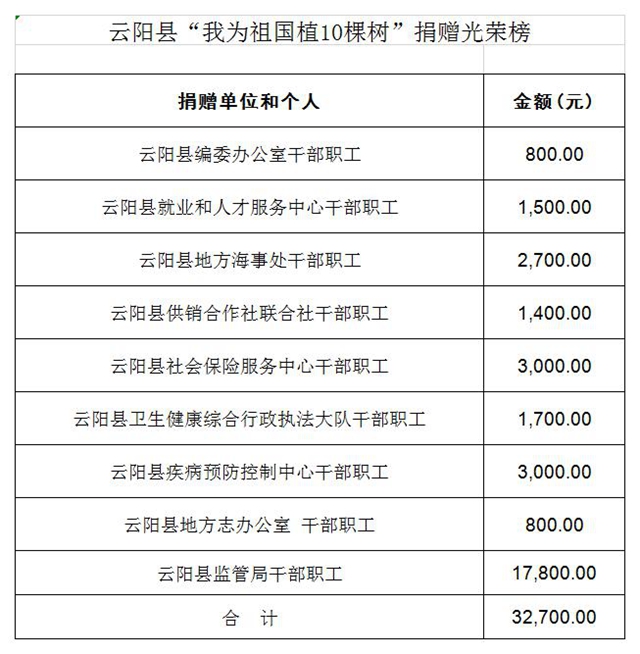 云陽縣“我為祖國植10棵樹”捐贈光榮榜