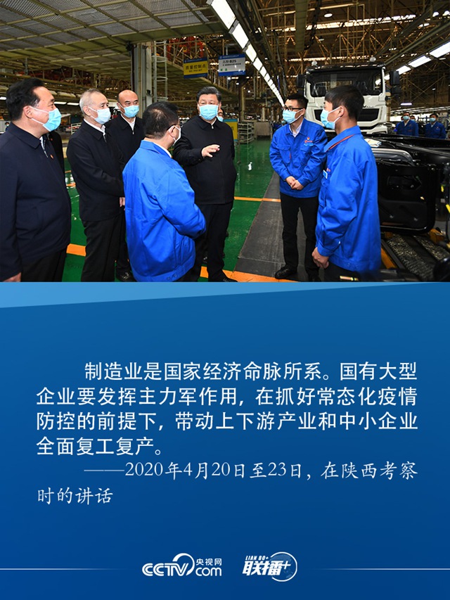 4月22日,習近平來到陜西汽車控股集團有限公司總裝車間察看生產線,了解產品研發、生產、銷售和復工復產情況,對他們克服疫情影響創產銷歷史新高表示贊賞。