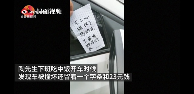 2.【小學生撞私家車后留23元道歉 車主:原諒他了,比成年人勇敢】 5月6日,江蘇鹽城。陶先生下班吃中飯開車時候,發現車上留著一個字條,上面寫著“不小心碰壞你的車,下邊有賠你的錢”落款某某小學某某。更讓陶先生吃驚的是,這個小學生還用黑筆畫了長長的記號,分別指出碰撞處和車輪下留的23塊錢。陶先生表示原諒他了,還稱這個小學生比一般成年人勇敢有擔當。