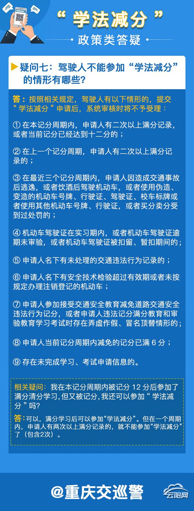 縣交巡警大隊介紹,只要是持有重慶市公安交管部門核發駕駛證的駕駛人均可申請參加“學法減分”,不區分駕駛證準駕類型,也不區分是否為營運車輛駕駛人。不過,駕駛人有以下情形的,提交“學法減分”申請后,系統審核時將不予受理: