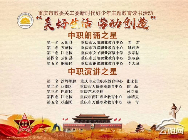 經過激烈角逐,活動最終評選出特等獎10名。其中,云陽職教中心鄧君、張雙燕,立信職教中心張宋佳,萬盛職教中心姚茂杰、時磊、楊青,女子職中張彩潔,銅梁職教中心李志豪,市藝術學校孫立栗,兩江職教中心楊靖雯共計10名優勝選手將代表全市中職學生進軍全國朗誦演講展示活動。