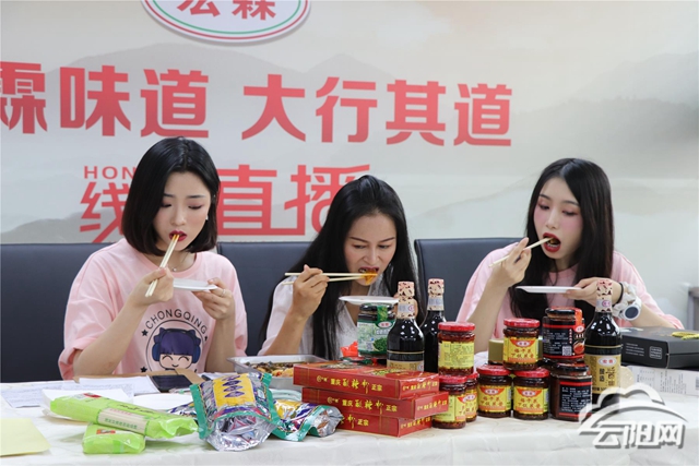 在盤龍創業園重慶宏霖食品有限公司直播間里,團員青年代表和該公司總經理譚曉紅組成吃播團隊,現場試吃公司新推出的香辣烤魚、豆豉烤魚、麻辣小龍蝦等產品。主播們還現場煮了一碗云陽面,加入宏霖食品有限公司的手工釀造醬油、花椒醬、蘿卜干醬等調料,對著鏡頭大快朵頤。“這就是重慶味道,麻辣鮮香,快買快買?!?/p>