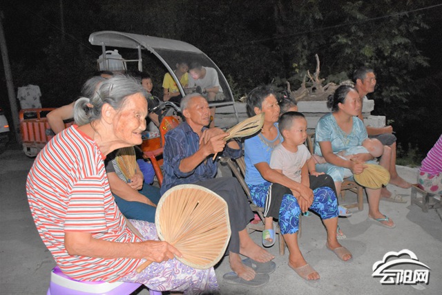 這里大多數都是老人、婦女、兒童,他們早早吃過晚飯后,端著凳子,拿著扇子,耐心地等待著電影放映的那一刻。